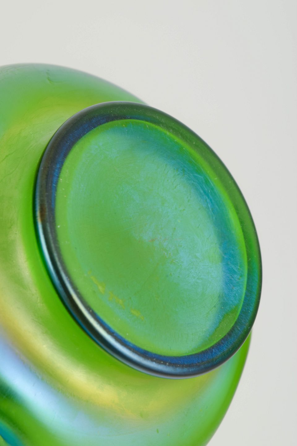 Art Nouveau-vase i iriserende kunstglas med klar grøn grundtone og blødt afrundede, organiske former. Lav og bred bug med let indtrukket hals, afsluttet med dekorativ tinmontering udført i et stiliseret, naturinspireret motiv. Overfladen viser et diskret farvespil med blålige nuancer mod foden, karakteristisk for perioden.