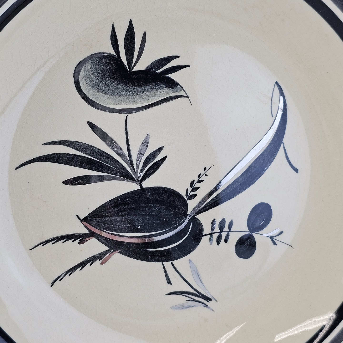 Råhvidt fajancestel i stelform E med dekoration af naturmotiver i sølv og sort farve.