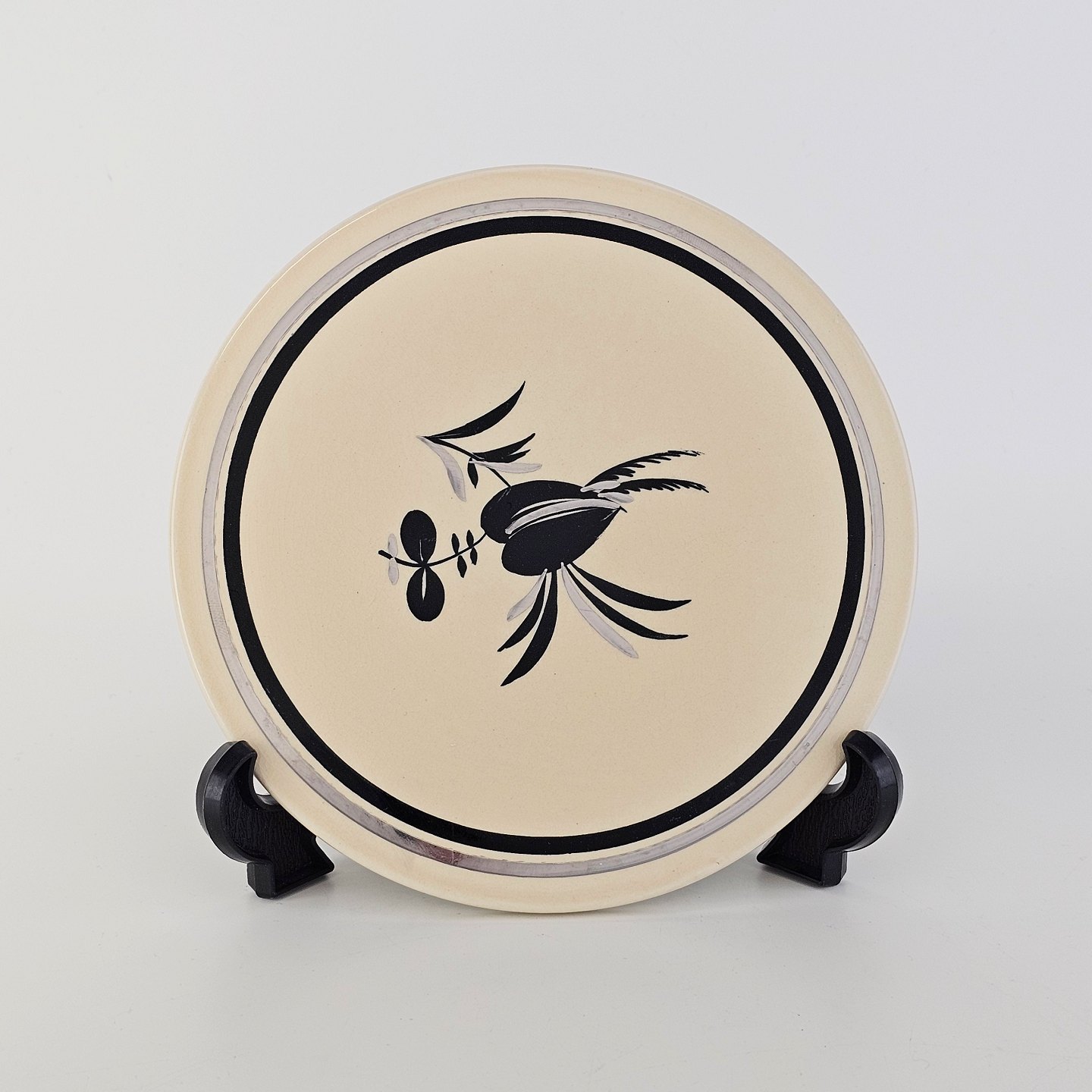 Råhvidt fajancestel i stelform E med dekoration af naturmotiver i sølv og sort farve.