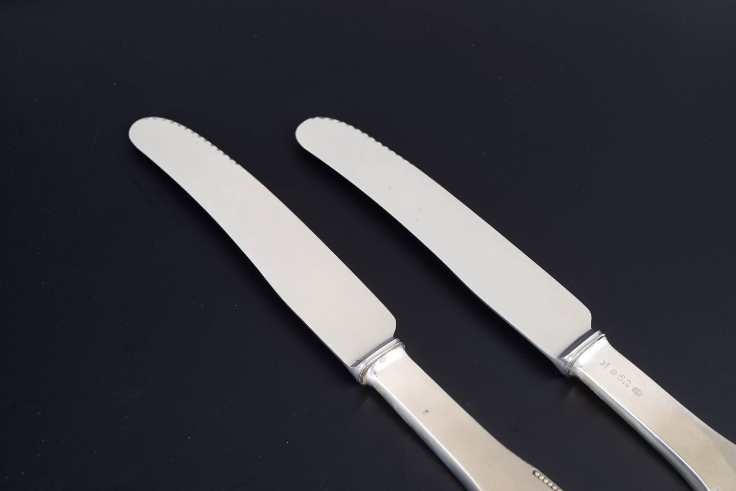 Elegante middagsknive i tretårnet sølv og rustfrit stål. Model nummer 14 med klassisk, let afrundet skaftform med diskret perlekant og glat klinge med skær. Fremstillet hos Evald Nielsen, længde 23,5 cm.