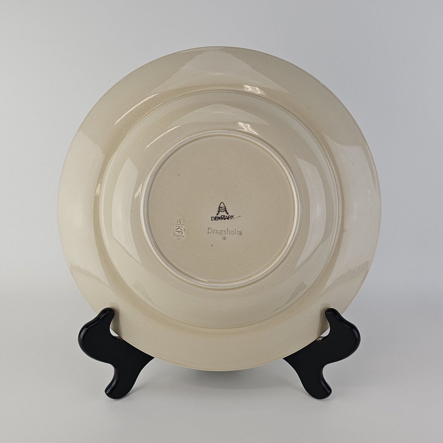 Dyb tallerken i fajance fra stellet Dragsholm fremstillet i perioden 1934-1965.