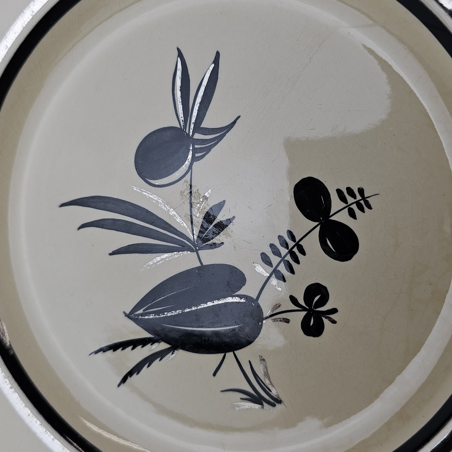 Råhvidt fajancestel i stelform E med dekoration af naturmotiver i sølv og sort farve.