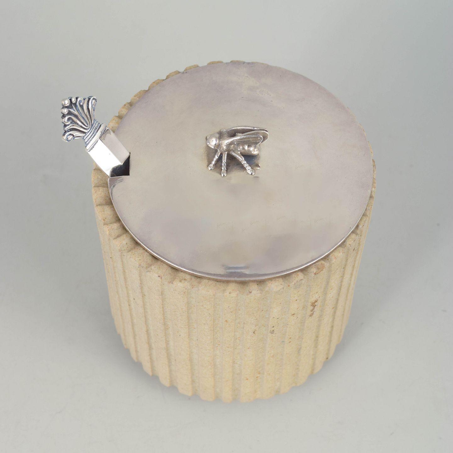Hånddrejet cylindrisk stentøjskrukke med lodret riflet korpus og lys, mat glasur. Monteret med låg i sterlingsølv samt ske fra Georg Jensen, i det klassiske dronninge-mønster, udført i 1940’erne.