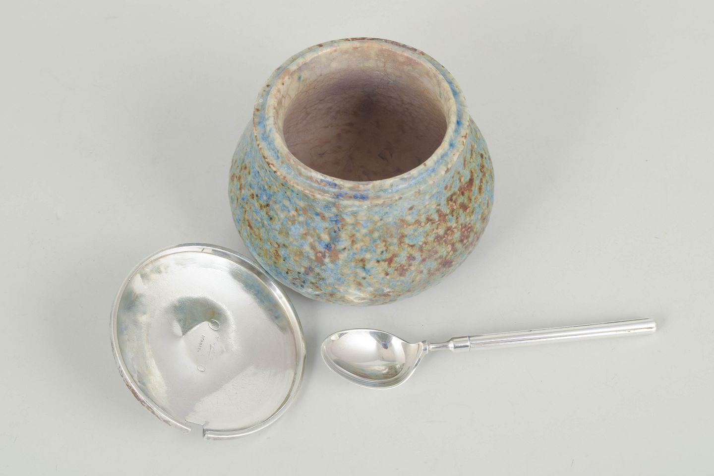 Hånddrejet stentøjskrukke med rund, let udadbøjet form og flerfarvet glasur i blå, grønne og brunlige nuancer. Monteret med låg og ske i sterlingsølv udført af Hans Hansen, i en elegant art deco udformning fra 1939.