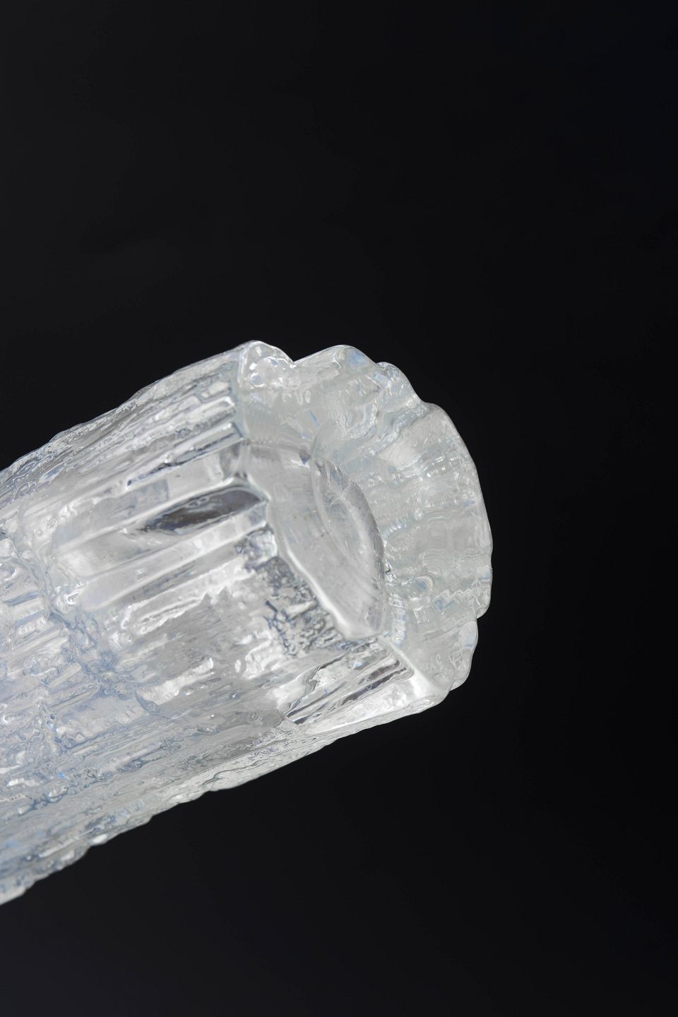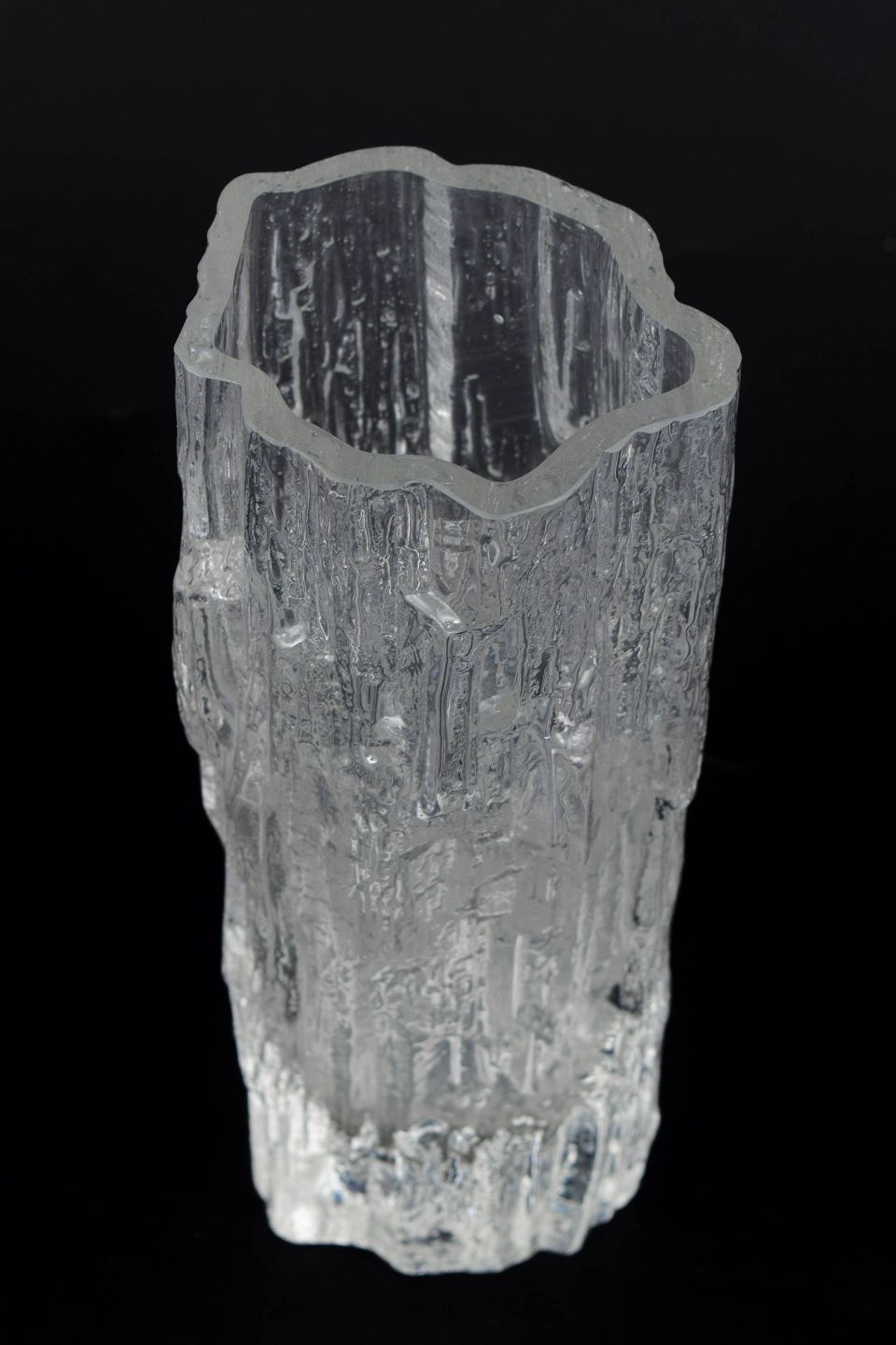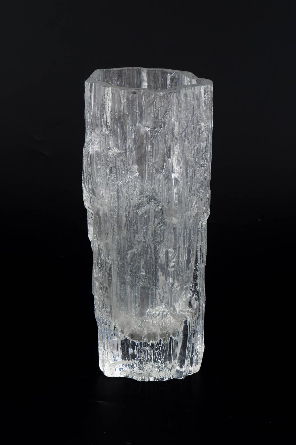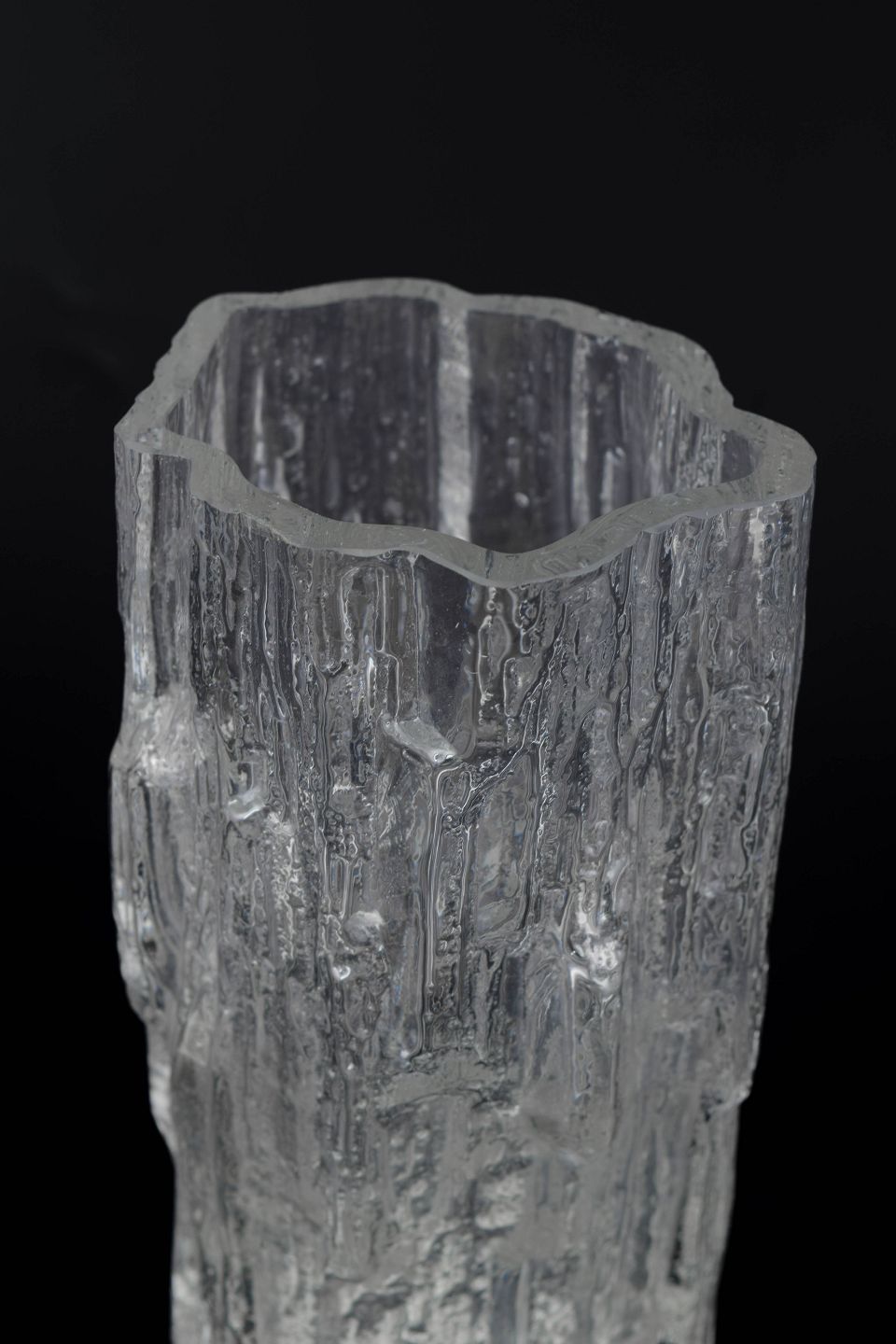 Klar glasvase med markant isstruktureret overflade og lodrette reliefmønstre inspireret af smeltende is. Høj, slank cylindrisk form med let ujævn kant.