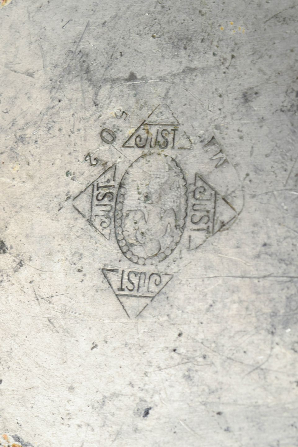 Stor kande i tin med flettet hank og blødt svunget korpus udført i et elegant art deco formsprog. Model 502.