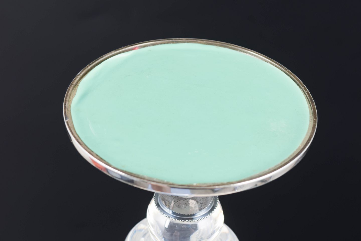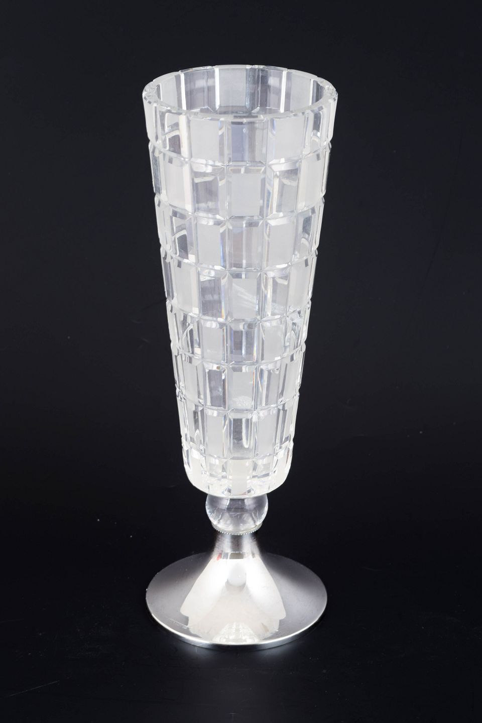 Modernistisk vase i slebet krystal med geometrisk mønster og fod i 813 sølv. Designet fremstår med klar, arkitektonisk struktur typisk for finsk glasdesign fra perioden.