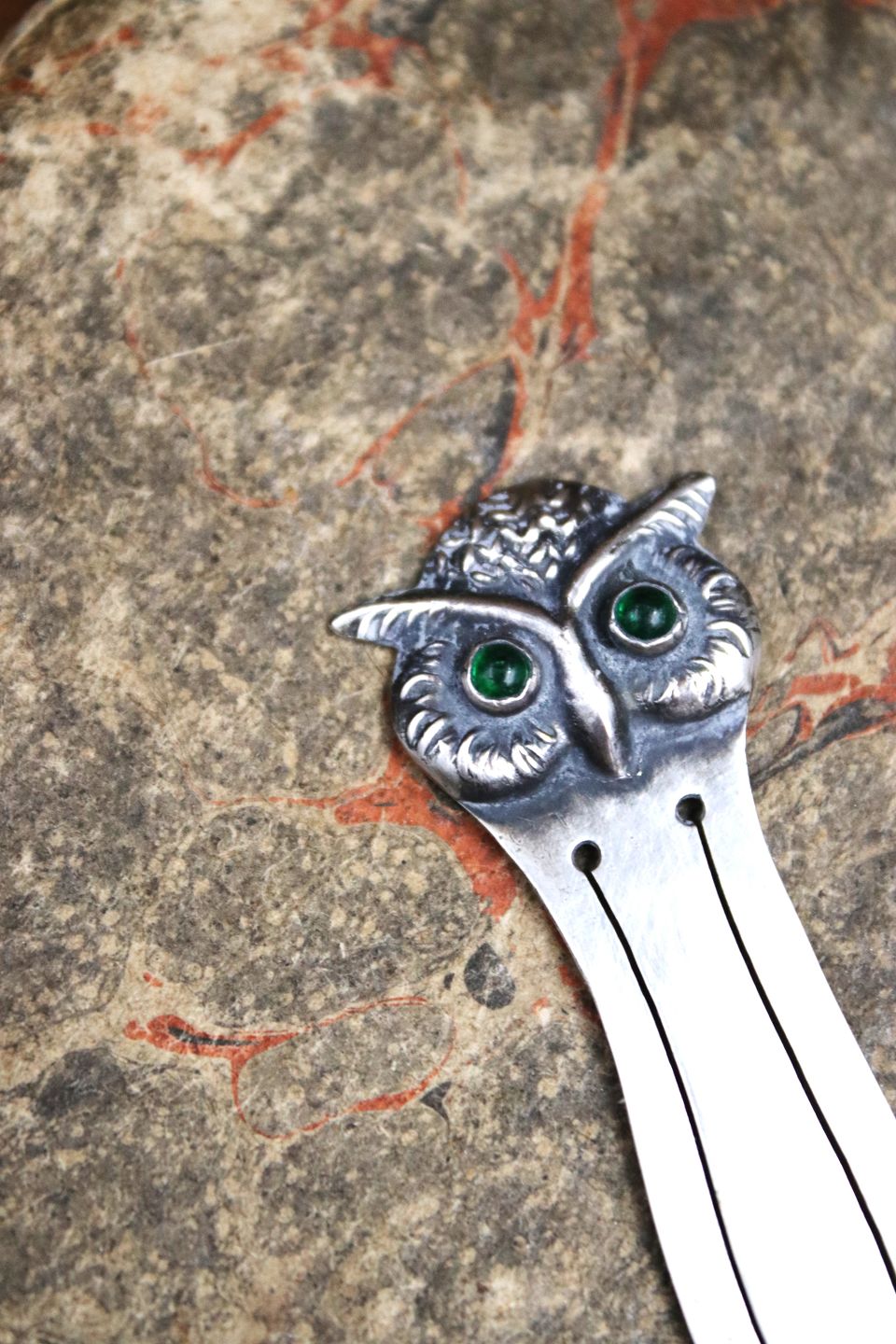 Gammelt bogmærke i sølv i form af en lille ugle med grønne glas øjne.