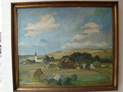 Maleri - Knud Stærmose - "Landskab med udsigt over by".