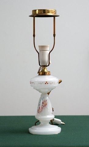 Hvid opalinelampe med blomstermønster ca. 1880.