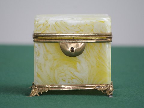 Gul og hvid meleret sukkerskrin i opalineglas ca. 1880 på messing bund
