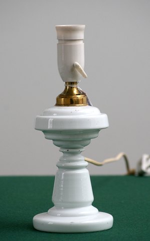 Hvid opaline petroleumslampe. Ændret til elektricitet. Højde 28 cm.