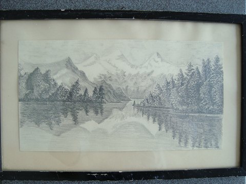 Tegning af Karl Nielsen 1956 "Bjergparti med sø".