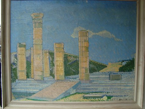 Et meget spændende og anderledes maleri - sikkert malet under Olsens studietur til Grækenland i 1950'erne, mens han gik på Kunstakademiet i København under professorerne Aksel Jørgensen og Olaf Rude.