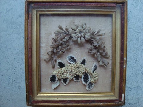 Stor buket lavet af hovedhår, samt en buket lavet af tørrede blomster - alt opsat på silke.
