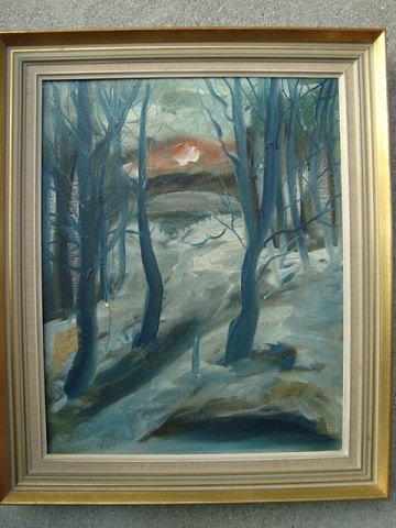 Maleri af Johannes Thorbjørn - Vinterparti fra skov med solnedgang.