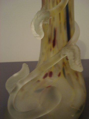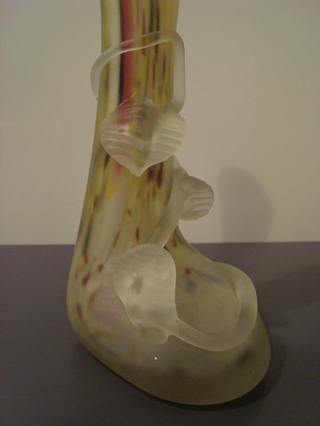 Italiensk kunstglasvase - flerfarvet glas med matte bladranker påsat.