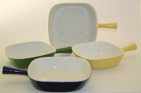 Text available in Danish: Lyngby Dan-ild med glasurfarver, gul 2100, grøn 2500, blå 2600. Design Axel Brüel i 1958. Ildfast porcelæn.