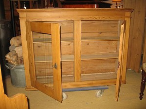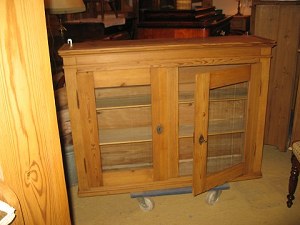 Vitrineskab afsyret fyrretræ med 2 låger Originalt skab Restaureret. mål B 116, H 85, D 29,cm. 6055/56/58-P Kan males efter eget ønske.