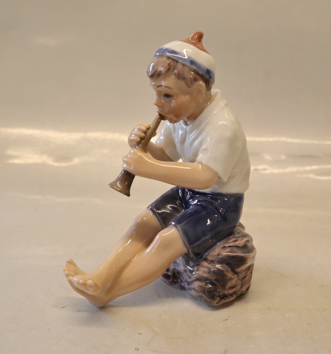 Dahl Jensen 1218 Dreng med trompet 14 cm (DJ). Den lille hornblæser. Mærket med kongelig krone og DJ Copenhagen i hel og fin stand.