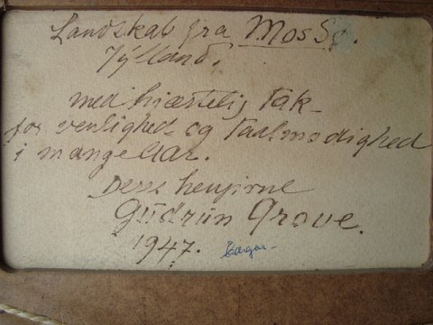 Bagpå dedikeret, dateret 1947 og underskrevet Gudrun Grove.