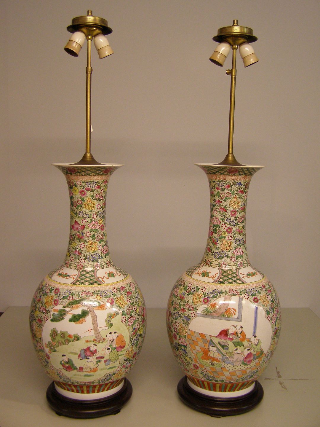 Et par store bordlamper på stand af træ, bemalet med figurer, H: 58cm. der er desværre en brændingsfejl som det fremgår af billeder