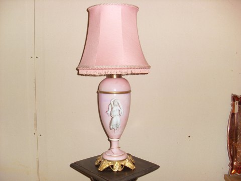 Text zugänglich auf Dänische: Bord lampe i lyserødt porcelæn med romersk kvinde motiv, lampen er monteret på forgyldt bronze fod.