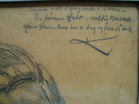 Betegnet: "Agner gik syngende i Døden - En fornem Helt - Vældig Bersærk - Hans Navnebror her er dog ogsaa stærk" - signeret - K.