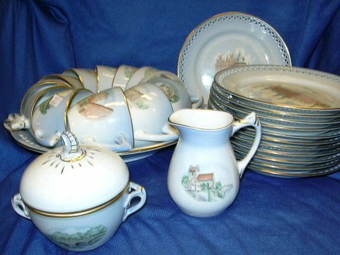 kaffestel danmarksstellet med slotte og kirker fra Bing og grøndahl 11 kop 12 dec.tall fad med øre sukker&fløde