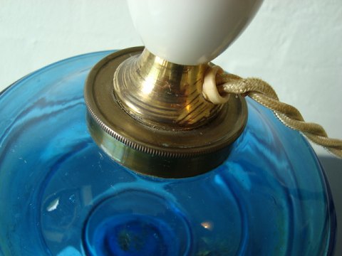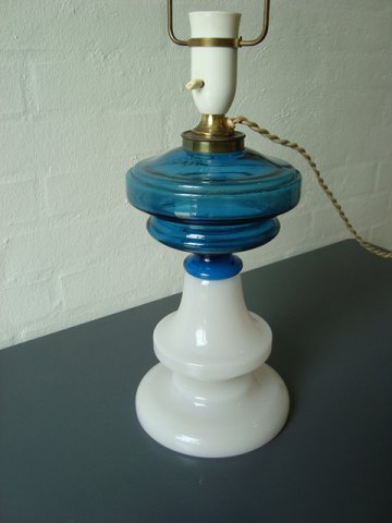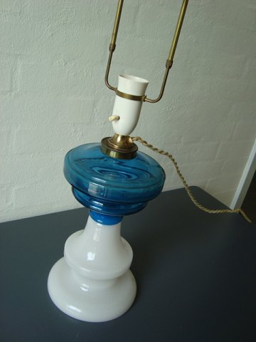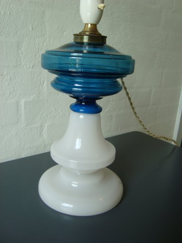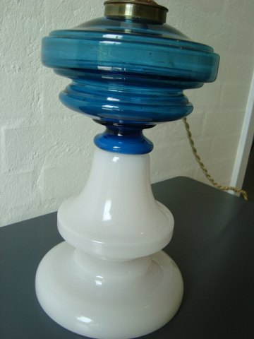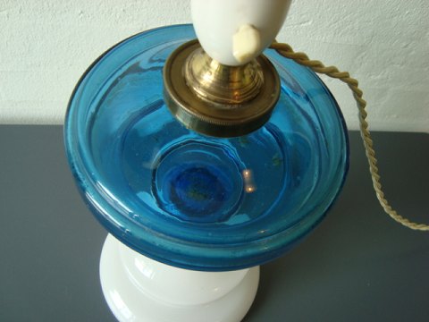 Gammel petroleumslampe af hvid opaline og turkis glas omlavet til el.