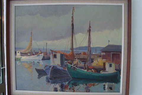 Maleri af H. Ytting - Fiskekuttere i havn.