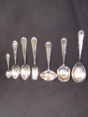 | Essen Besteck Silverplate. 12 Abendessen Gabeln, 12 Abendessen Löffel, 12 Mittagessen, Löffel, 12 Kaffeelöffel, sovseske, Kartoffel, kleine Suppenkelle. Preis Dkr. 1800