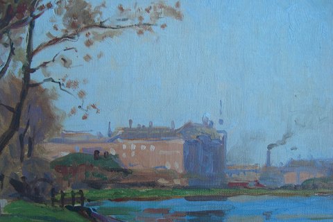 Maleri af Aage Lundgreen - Fabriksanlæg ved sø.