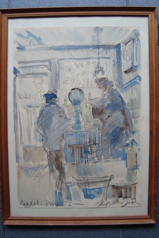 Akvarel af Aksel Lundgreen - Hos spåkonen Mme Pradal, Paris 1952.