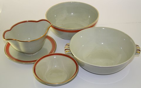 Text available in Danish: Aluminia, Tureby, grå fajance med orange fane samt guldkant. Designet af Nils Thorsson 1934-1968.