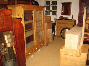 Stor salgsudstilling med restaurerede møbler håndpolerede mahognimøbler, afsyrede fyrretræsmøbler, malede træmøbler, kun originale gamle og antikke møbler.
