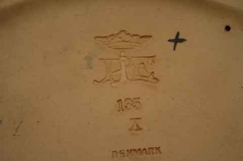 P. Ipsens Enke, fad med druer god stand, dog er der 2 bitte små chips, se ekstra foto. Højde 6 cm. Diameter 30 cm. Pris: 475 kr.