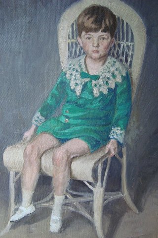 Dreng i grøn dragt og kniplingskrave, siddende i kurvestol, 1914.