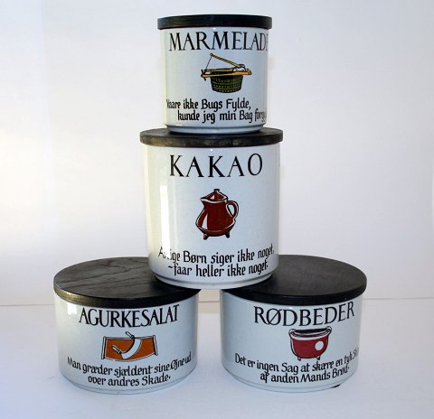 Knabstrup krukker ordsprogsserien. Grå krukker med sort trælåg.