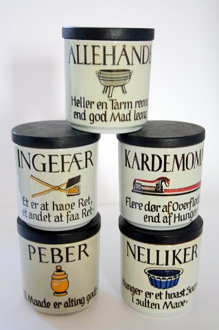 Knabstrup, Krydderikrukker ordsprogserien grå krukker med sort trælåg. God stand. Højde 7,5 cm. Diameter 7 cm. Pris: 60 kr. + 75 kr. stk.