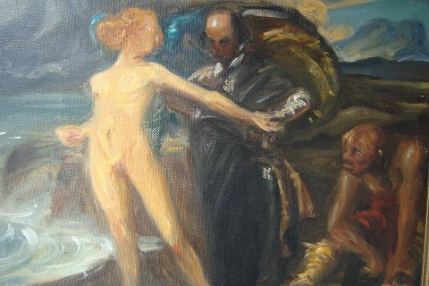 Motiv fra komedien "Stormen" (The Tempest 1610-11) af William Shakespeare (1565-1616). Personerne er Prospero, fyrste af Milano og datteren Miranda, der er strandet på en ø, hvor de finder monsteret "Caliban" som de gør til deres slave.