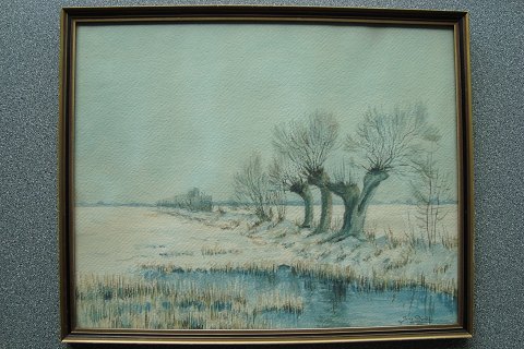 Akvarel af Jens Djelbo - Vinterparti med vådområde og stynede træer.