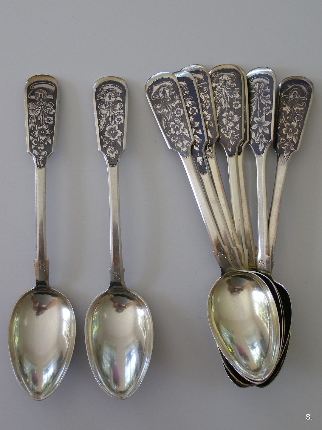 Russiske Dessertskeer rigt udsmykket niello på både for og bagside L:17cm. Uidentificerbar stempler