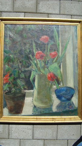 Text available in Danish: Maleri af Ewald Petersen 1948 - Opstilling med blomster med ymerskål i vindueskarm.