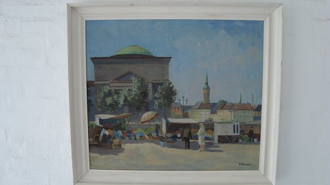 Maleri af V. Holm - Folkelive og blomstersælgere på Gammel Strand i København.