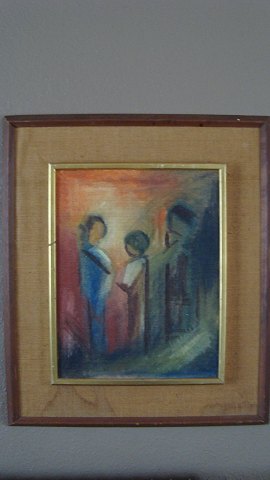 Text available in Danish: Spændende maleri af ubekendt kunstner - 3 personer i samtale.