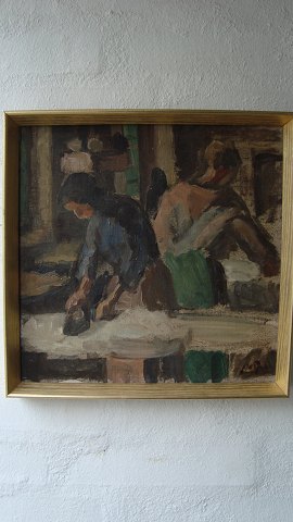Text available in Danish: Maleri af Majsa Bredsdorff - Interiør med strygekoner og rullekoner 1913?.