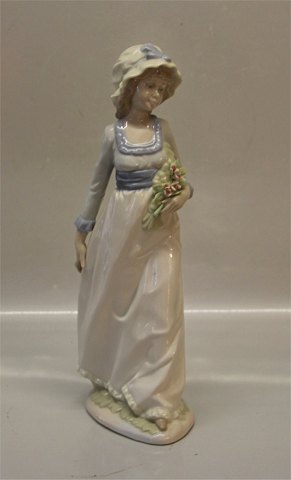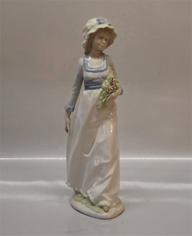 Stor Spansk figur Nadal: Pige med kyse og blomster 34 cm I stil med Lladro, Dao, Nao fra Spanien Mærket Nadal Handcrafted Spanish Porcelain