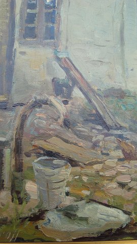Gårdexteriør fra en gård i Aalborg med dreng og høns.