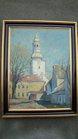 Maleri af Einar Gross - Motiv fra Aalborg med Budolfi Kirke og den gamle bispegård.